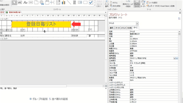 レポートのデザインビューを閉じた後に、レポート開くと下図ようになります。レポートのタイトルらしく文字の大きさを変えたり、表示位置を変更したり、文字色を変更したりしました。タイトルの「登録日毎リスト」には枠線が存在しますがこの枠線はない方がタイトルらしいので削除します。