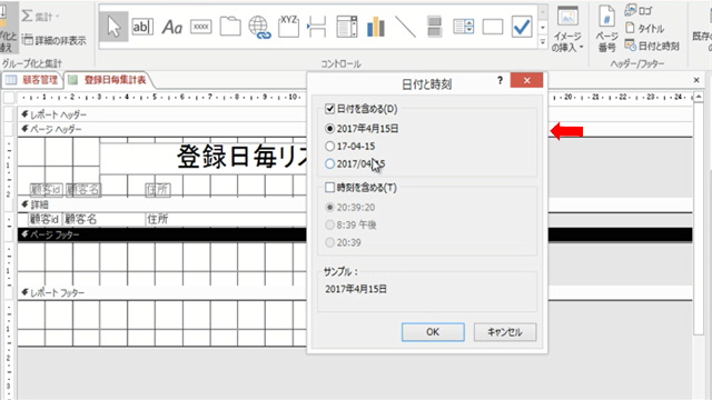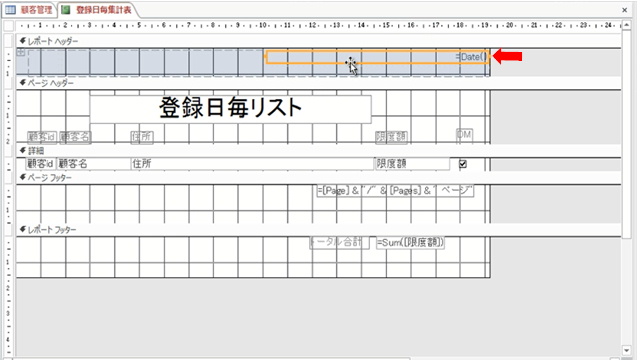 下図の通りに、レポートヘッダー部分に日付が表示されるようになりました。