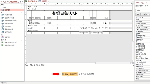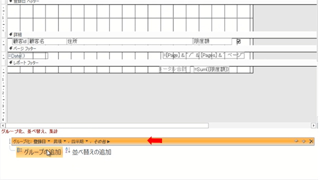 下図は、登録日を追加した図です。この状態でレポートがどのように表示されるかを確認します。