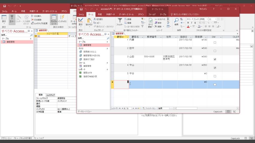 同様にして、デザインビューで「顧客管理」というテーブルの中に、順次、必要とする項目とその項目のデータ型を定義していきます。
