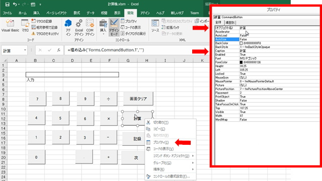 上図で、上部の「開発」タグが選択されている状態で、「デザインモード」を選択し、「計算」ボタンを選択した後に、マウスの右クリックでメニューを表示し、「プロパティ」を選択します。すると、上図の赤枠で囲まれいる通り、ボタンのプロパティが表示されます。