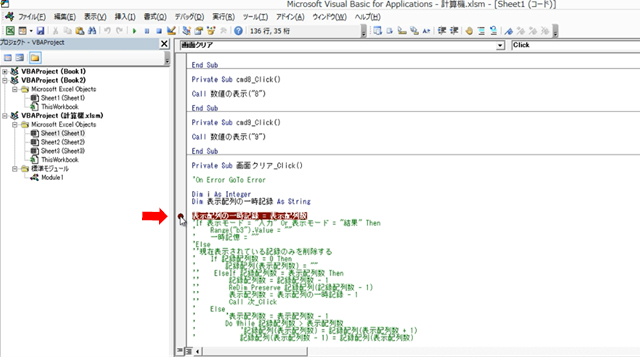 ちなみに、記録配列を表示していない時(「表示モード」変数の値が「記録)でない時)は単純にセル「B3」の値を削除するだけですので、Else以下の